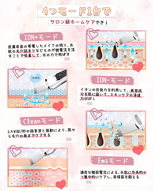 - 【多機能美顔器】一台4役。エステサロン級の美肌ケアを手軽に自宅で実現できます。約6分間自動電源オフ機能を備え、各モードの動作開始時らか約6分間後で電源が自動でオフになります。使用時間を心配ずに、手軽に使用でて、初めての人も使いやすい美顔器です。男女兼用です。