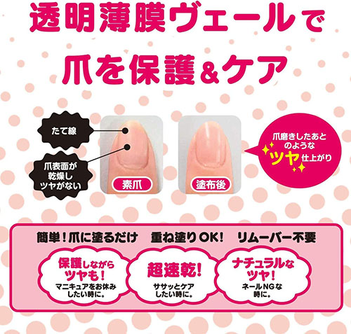 - ほんのりピンク色で、爪磨きしたようなナチュラルなツヤ仕上げです。トルエンフリー、無香料で爪へのやさしさを配慮。